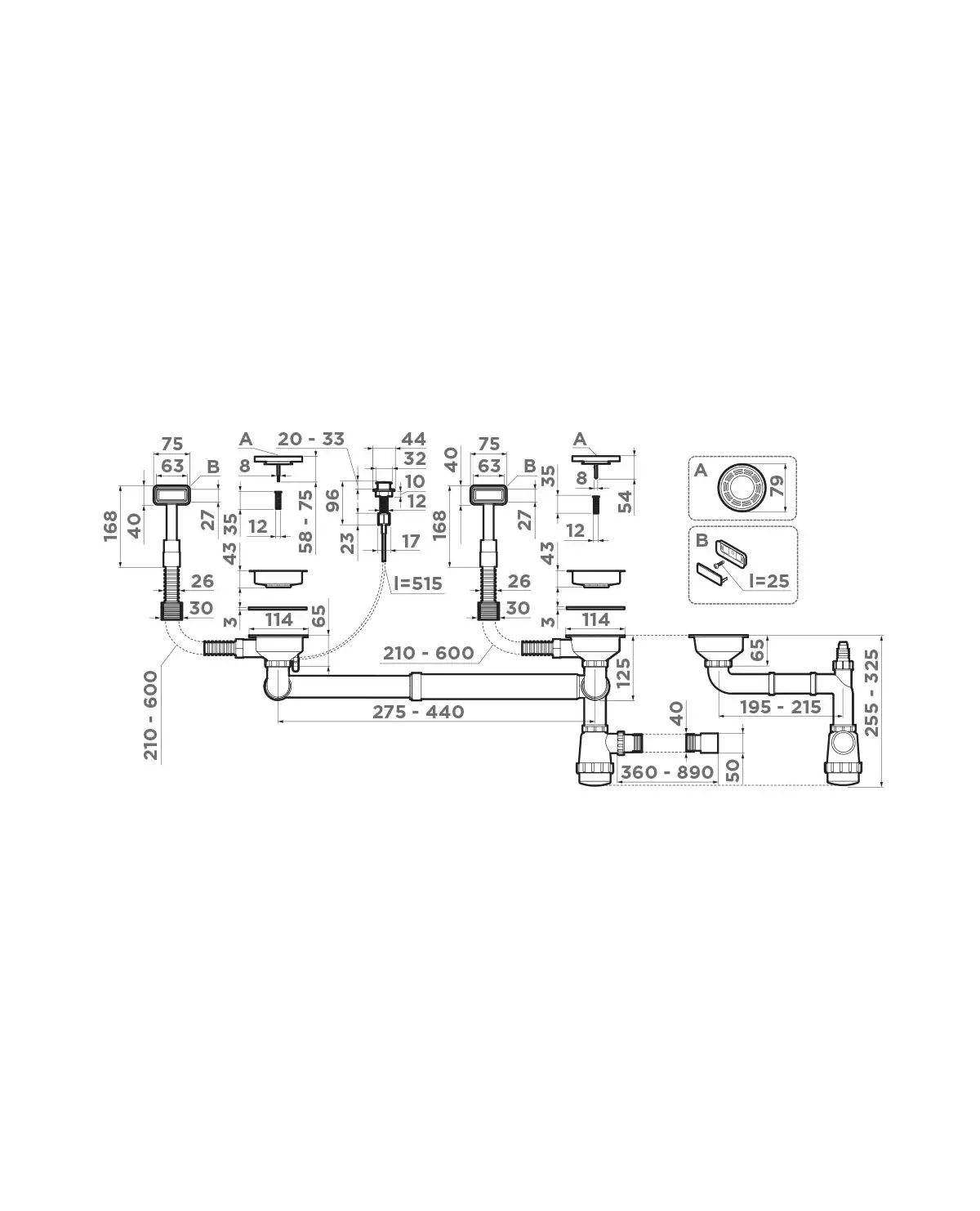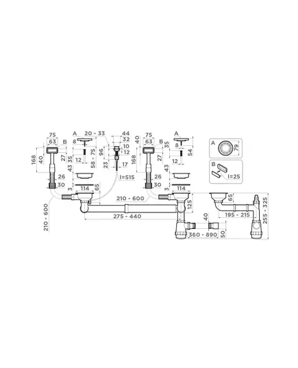 - Арматура для двухчашевых моек с прямоугольными переливами, декоративными решетками и клапаном-автомат.