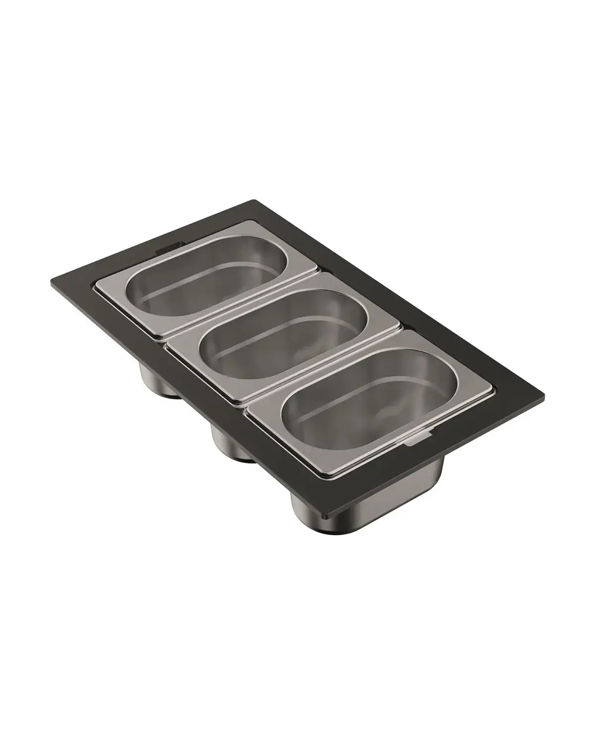 - Чаши свободно вынимаются из пластиковой подставки и перемещаются, а конструкция подставки разработана таким образом, чтобы ее можно было удобно разместить на внутренних ступенчатых направляющих моек.