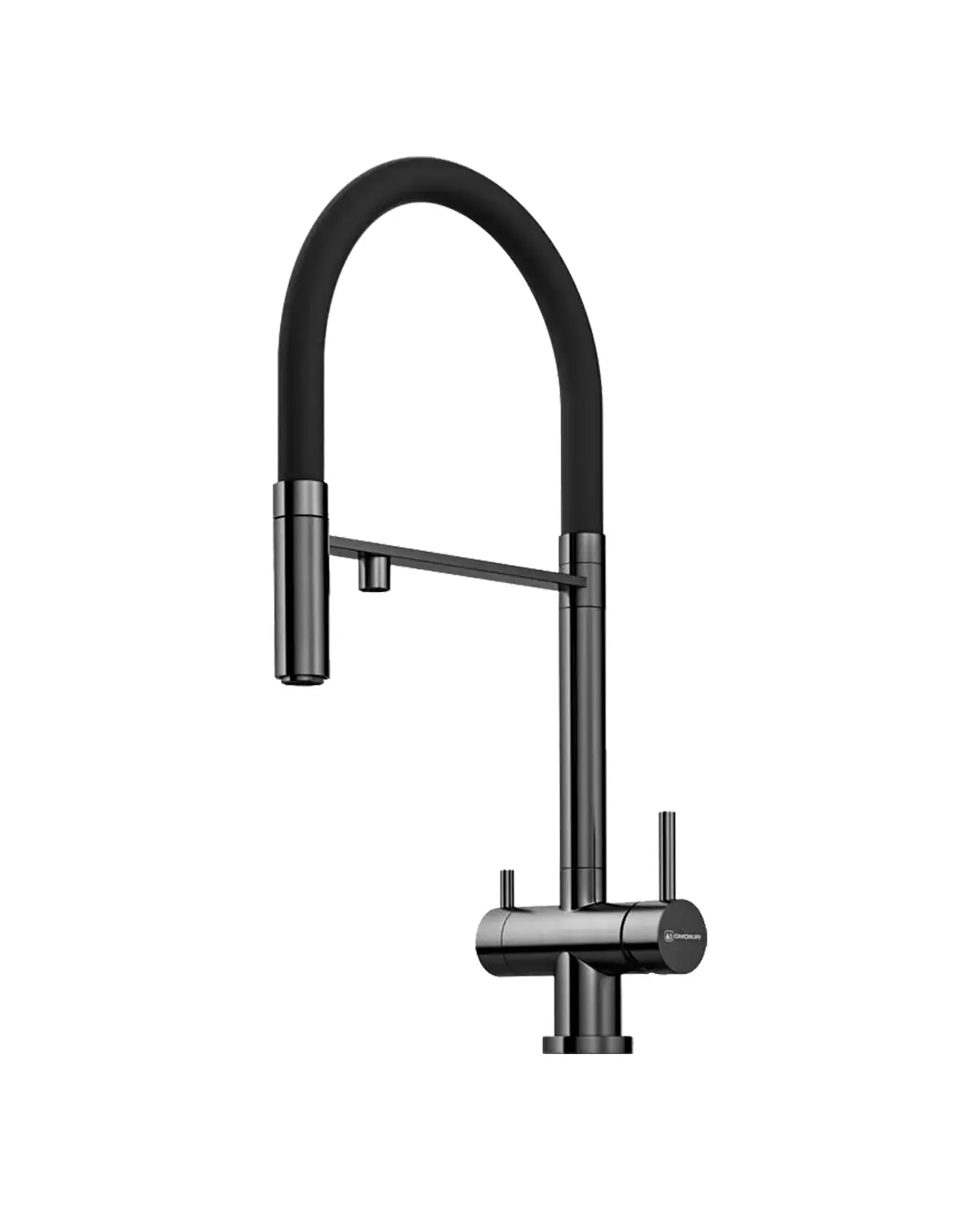 Уникальность смесителя заключается в том, что это единственный на рынке кухонный смеситель который сочетает в себе возможность подключения фильтра для питьевой воды и подвижный излив для основной (хол. и гор.) воды, с помощью которого струю можно направлять абсолютно в любую сторону.