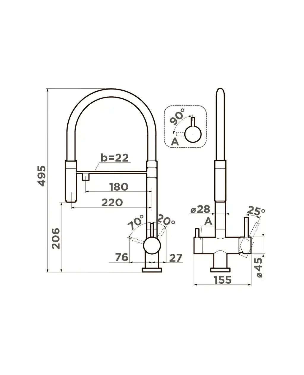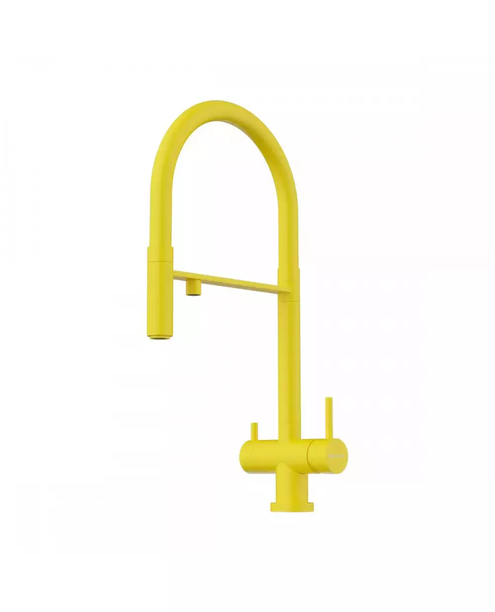Уникальность смесителя заключается в том, что это единственный на рынке кухонный смеситель который сочетает в себе возможность подключения фильтра для питьевой воды и подвижный излив для основной (хол. и гор.) воды, с помощью которого струю можно направлять абсолютно в любую сторону.