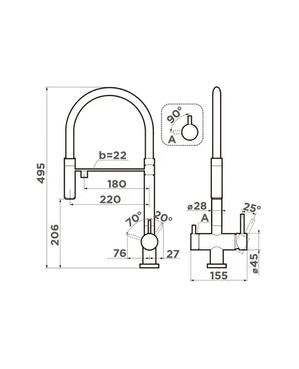 Высота смесителя – 49,5 сантиметров, а длина излива – 220 мм.
